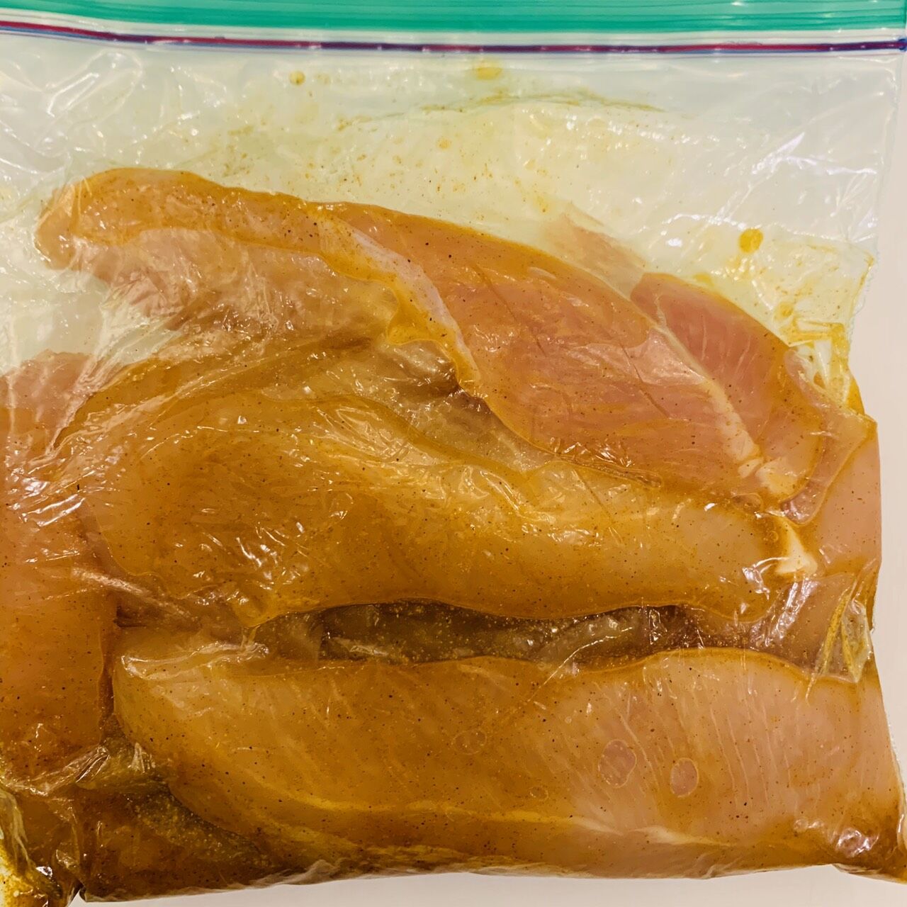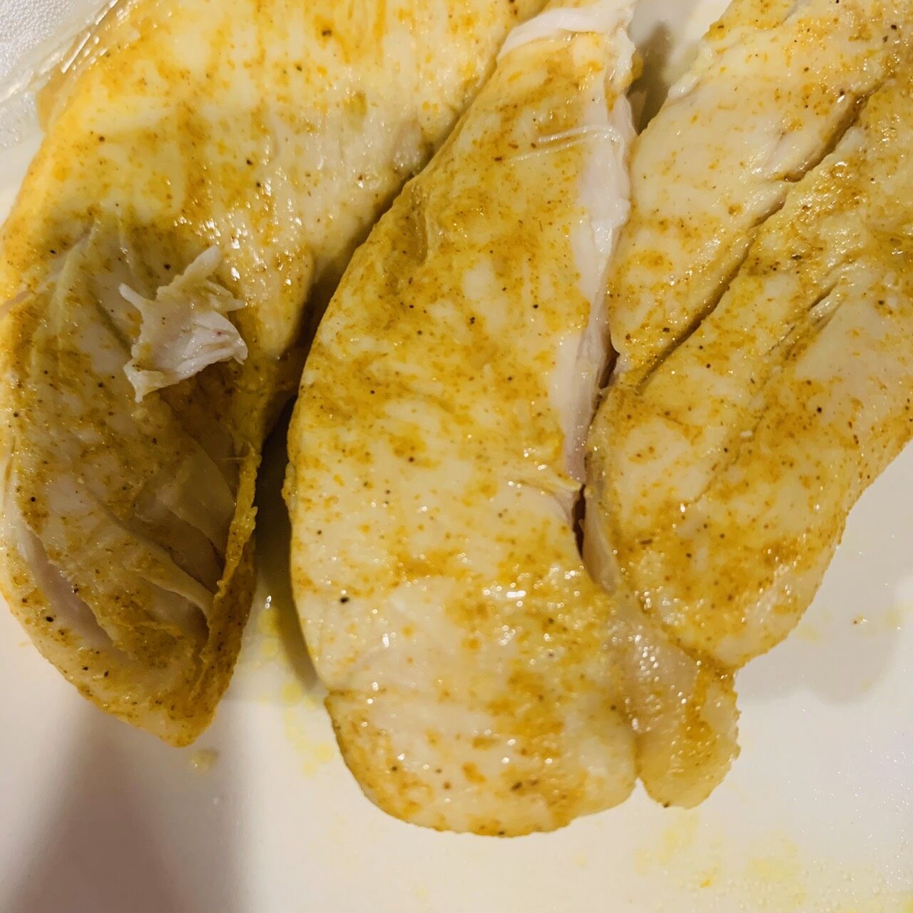 前日から筋をとったササミをカレー粉、米油、塩少々に漬け込んで、キッチンペーパーに包んでレンチンするだけというお料理。